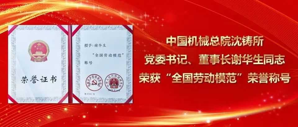 4月28日,全國勞動模范和先進工作者表彰大會在北京人民大會堂召開,中國機械總院集團沈陽鑄造研究所有限公司黨委書記、董事長謝華生榮獲“全國勞動模范”榮譽稱號。